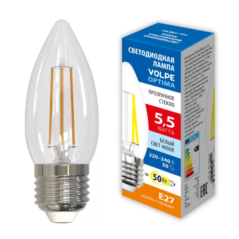 - Лампочка светодиодная филаментная Optima Филамент LED-C35-5,5W/4000K/E27/CL/SLF Volpe