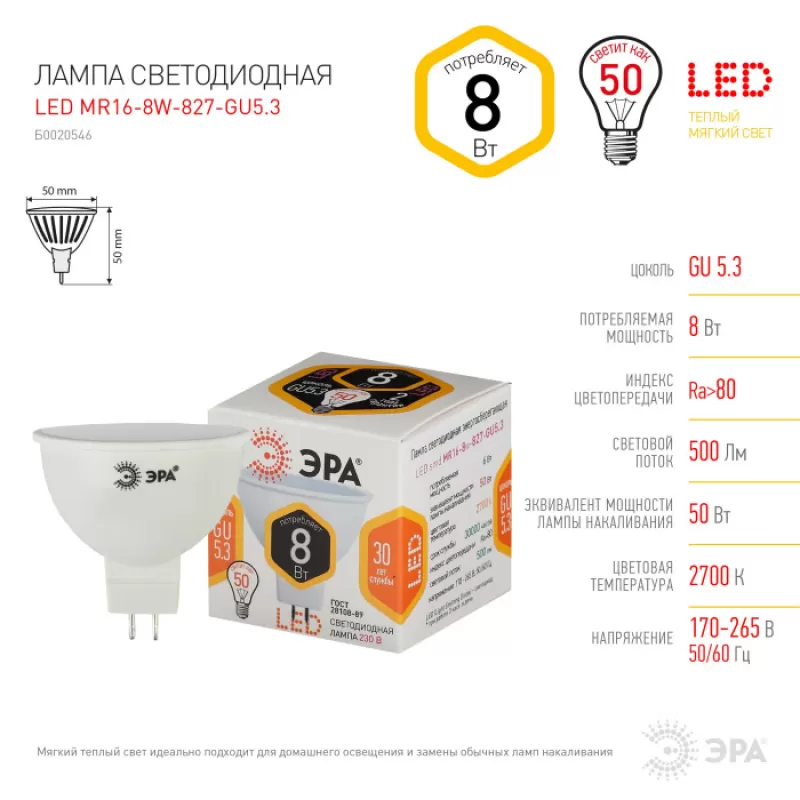 - Артикул:LED MR16-8W-827-GU5.3