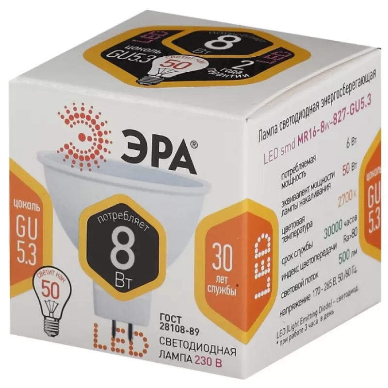 Лампочка светодиодная LED MR16-8W-827-GU5.3 ЭРА