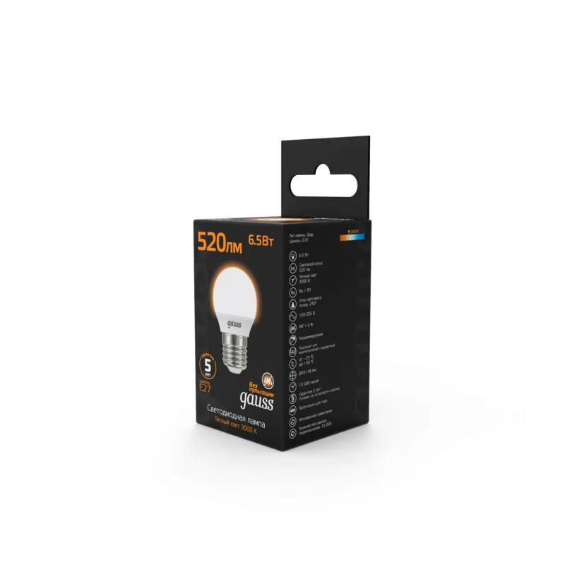 | Светодиодная лампочка в форме шара с цоколем E27 и размерами 87 мм по высоте и диаметром в 45 мм обладает мощностью в 6.5 W, благодаря чему она может осветить 3.3 кв. м. Цветовая температура – 2700 К, т.е. теплый свет близкий к цвету Солнца. Изделие рассчитано на использование в сети с переменным напряжением в 220-240В. |
