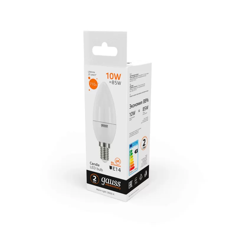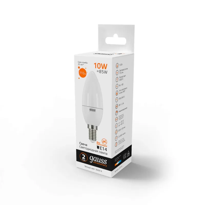 | Светодиодная лампочка в форме свечи с цоколем E14 и размерами 110 мм по высоте и диаметром в 38 мм обладает мощностью в 10 W, благодаря чему она может осветить 5 кв. м. Цветовая температура – 3000 К, т.е. теплый свет близкий к цвету Солнца. Изделие рассчитано на использование в сети с переменным напряжением в 220-240В. |