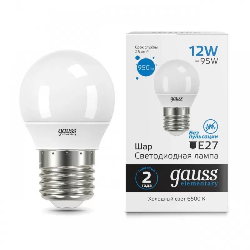 Светодиодная лампочка в форме шара с цоколем E27 и размерами 86 мм по высоте и диаметром в 45 мм обладает мощностью в 12 W, благодаря чему она может осветить 4 кв. м. Цветовая температура – 6500 К, т.е. холодный свет синего оттенка (не рекомендуется для применения на кухне, так как искажает цвет готовых блюд). Изделие рассчитано на использование в сети с переменным напряжением в 240В. |