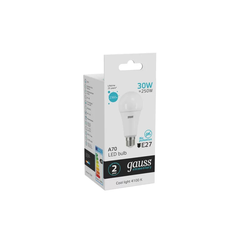 | Светодиодная лампочка в форме груши с цоколем E27 и размерами 143 мм по высоте и диаметром в 67 мм обладает мощностью в 30 W, благодаря чему она может осветить 10 кв. м. Цветовая температура – 4100 К, т.е. белый свет, подходящий для рабочего настроя (не рекомендуется для детской комнаты). Изделие рассчитано на использование в сети с переменным напряжением в 220-240В. |