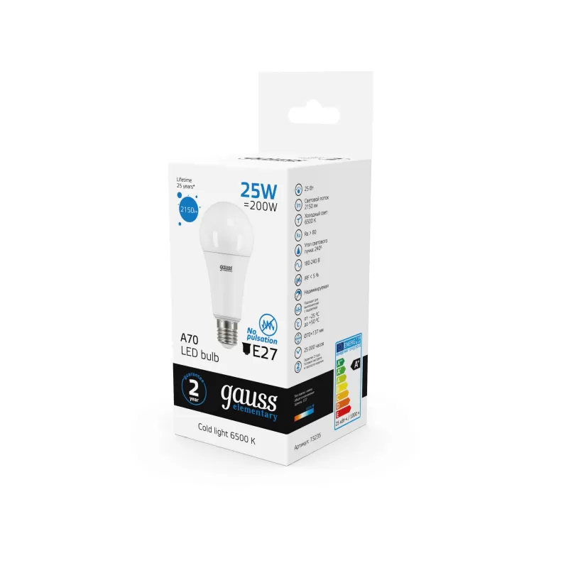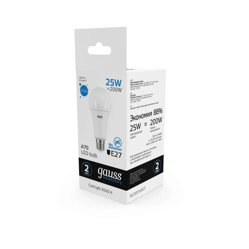 | Светодиодная лампочка в форме груши с цоколем E27 и размерами 143 мм по высоте и диаметром в 67 мм обладает мощностью в 25 W, благодаря чему она может осветить 12.5 кв. м. Цветовая температура – 6500 К, т.е. холодный свет синего оттенка (не рекомендуется для применения на кухне, так как искажает цвет готовых блюд). Изделие рассчитано на использование в сети с переменным напряжением в 220-240В. |