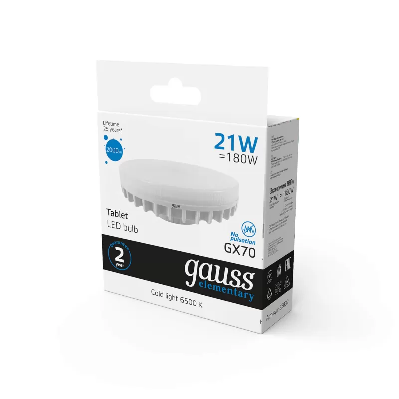Светодиодная лампочка с цоколем GX53 и размерами 24 мм по высоте и диаметром в 75 мм обладает мощностью в 21 W, благодаря чему она может осветить 7 кв. м. Изделие рассчитано на использование в сети с переменным напряжением в 230В. |