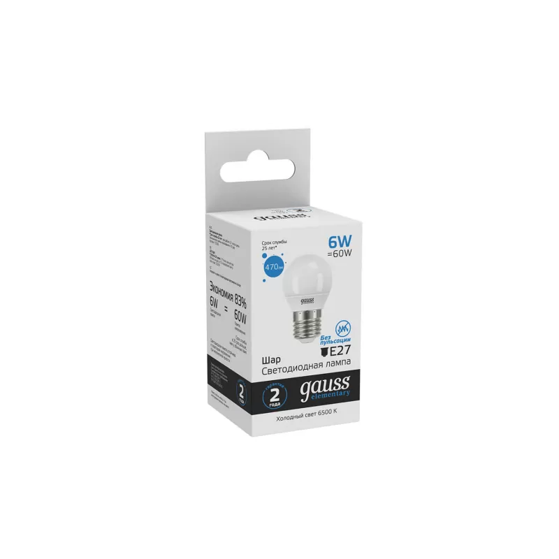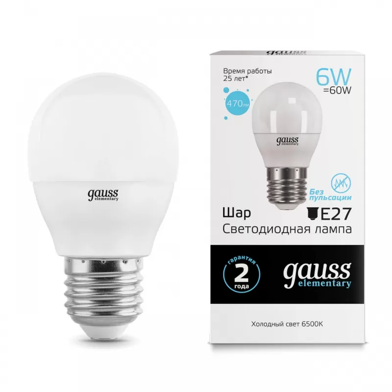 | Светодиодная лампочка в форме шара с цоколем E27 и размерами 89 мм по высоте и диаметром в 45 мм обладает мощностью в 6 W, благодаря чему она может осветить 3 кв. м. Цветовая температура – 6500 К, т.е. холодный свет синего оттенка (не рекомендуется для применения на кухне, так как искажает цвет готовых блюд). Изделие рассчитано на использование в сети с переменным напряжением в 220-240В. |