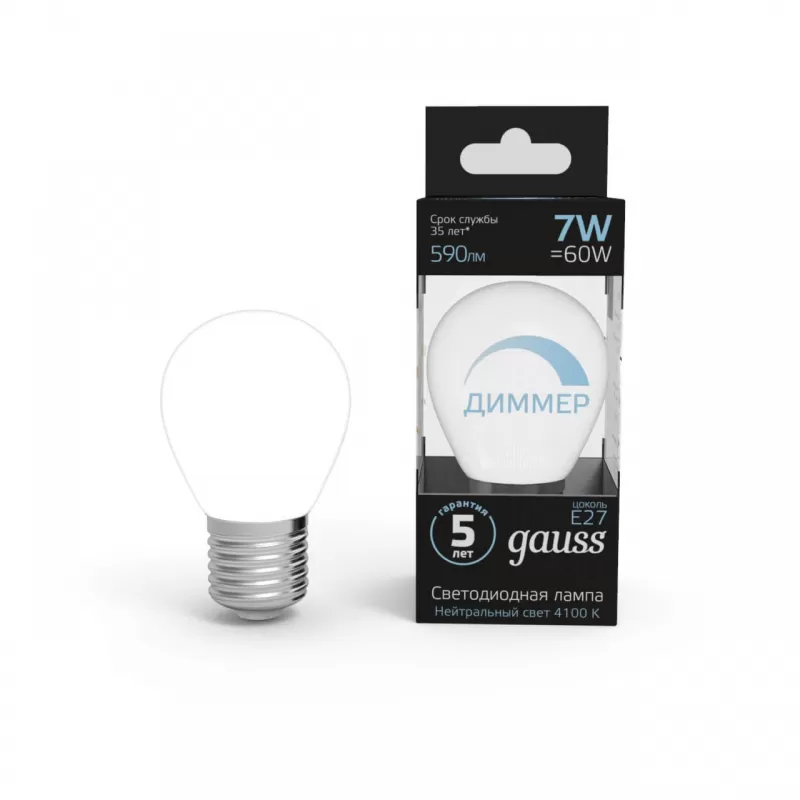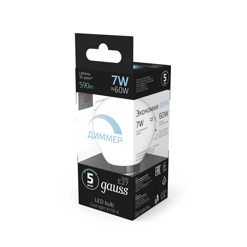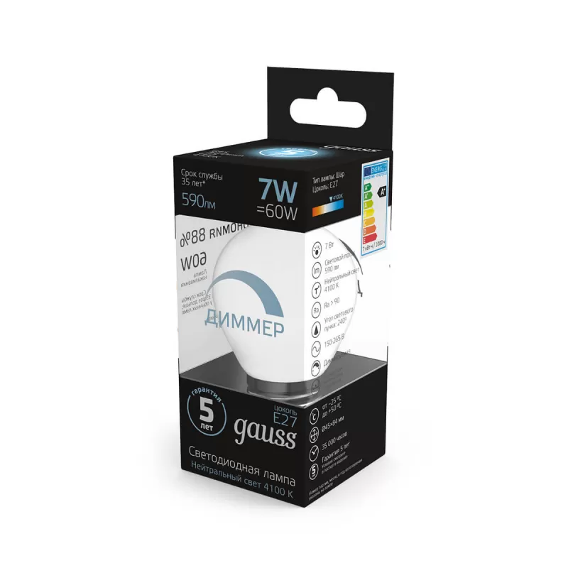 | Светодиодная лампочка в форме шара с цоколем E27 и размерами 110 мм по высоте и диаметром в 60 мм обладает мощностью в 7 W, благодаря чему она может осветить 3.5 кв. м. Цветовая температура – 4100 К, т.е. белый свет, подходящий для рабочего настроя (не рекомендуется для детской комнаты). Изделие рассчитано на использование в сети с переменным напряжением в 220-240В. Лампа может изменять силу свечения при использовании в технике, поддерживающей технологию диммирования. |