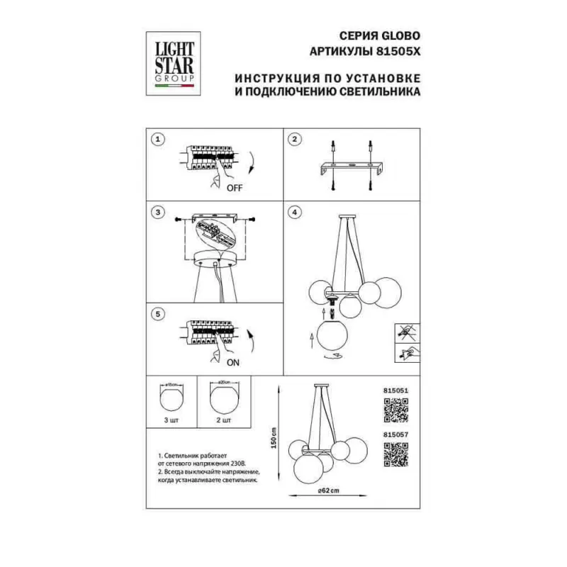 - Стеклянная подвесная люстра Globo 815051 белая форма шар Lightstar