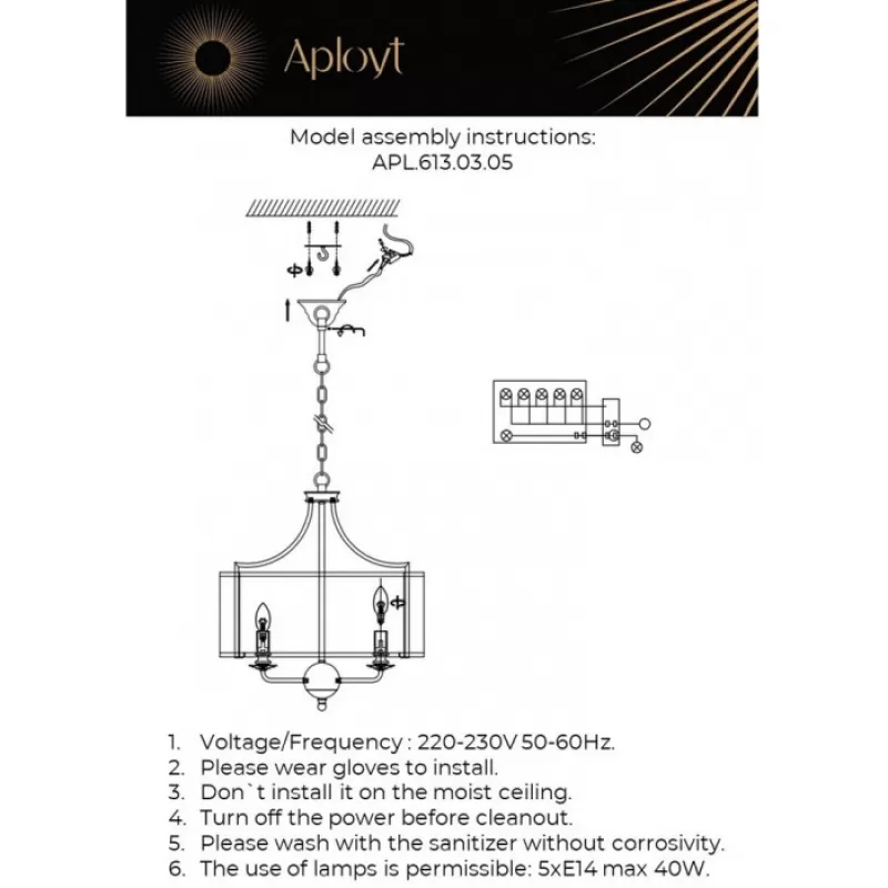 | Светильники бренда APLOYT отличают актуальный дизайн и превосходное качество. На представленную модель оригинальной люстры предоставляется гарантия сроком 2 года. На данной странице Вы можете внимательно ознакомиться с фото люстры и даже скачать 3D модель. Лампа накаливания или led является рекомендованным решением производителя. подвесная люстра с количеством ламп 5 - подходящее решение для стильного оформления пространства. металл является очень износостойким для арматуры люстр, ведь состав данного материала произведен в соответствии со всеми современными требованиями к светотехническим устройствам. Для дизайна в стиле арт-деко подвесная люстра APLOYT apl.613.03.05 также подойдёт, если творчески подойти к оформлению помещения. Замечательная подвесная люстра APLOYT apl.613.03.05 имеет степень защиты от пыли и влаги 20. подвесная люстра APLOYT высотой 1500 будет прекрасно смотреться как в уютном зале, так и на кухне. подвесная люстра APLOYT apl.613.03.05 сделает Ваш дом оригинальнее и будет дарить радость. |