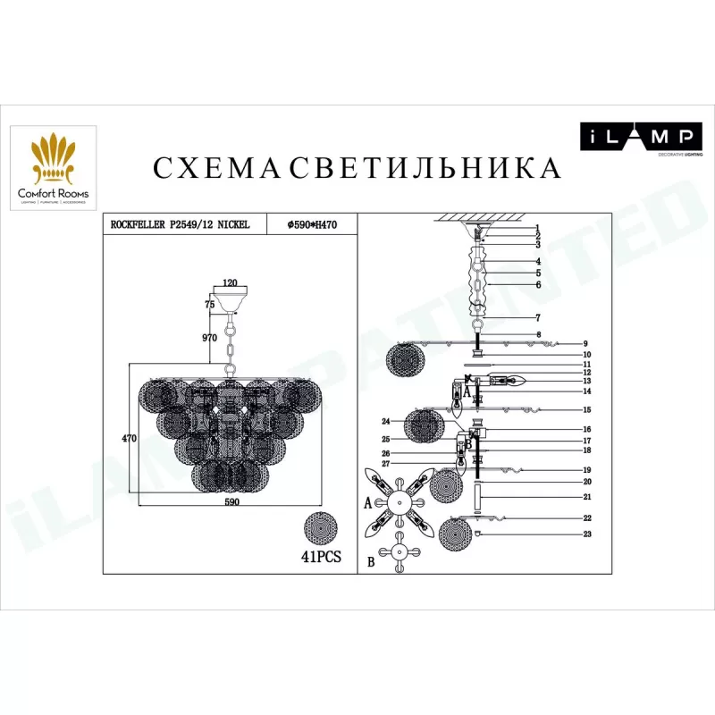 - Стеклянная подвесная люстра Rockfeller P2549-12 NIC прозрачная iLamp