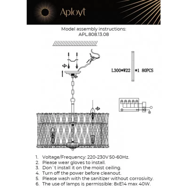 подвесная люстра APLOYT apl.808.13.08 из прекрасной коллекции Verene прекрасно впишется в современный интерьер любой комнаты, в том числе зала или спальни. Предлагаемую люстру APLOYT можно устанавливать при напряжении 220. Характеристики упаковки также указаны на странице. внешний вид данной люстры соответствует современным на сегодня трендам. подвесная люстра с количеством ламп 8 - превосходное решение для стильного оформления пространства. APLOYT является одним из самых известных лидеров изготовления осветительных приборов. На этой странице советуем посмотреть основные характеристики представленной модели и почитать отзывы покупателей. При выборе ламп следует иметь в виду, что тип цоколя данной модели e14. Будьте уверены, подвесная люстра APLOYT apl.808.13.08 обязательно украсит Ваш дом и обеспечит идеальное освещение. Подвесная люстра APLOYT APL.808.13.08 украсит дом и обеспечит отличное освещение. Осветительный прибор коллекции Verene на 320 Вт идеально подходит для помещений с высокими потолками и площадью до 24 кв.м. Ознакомьтесь с дополнительными характеристиками и отзывами и приобретайте подвесную люстру APL.808.13.08 с доставкой по Москве и другим городам России в магазине «SofitRoom».У нас действуют минимальные цены для этой модели. Возможен предварительный заказ. |