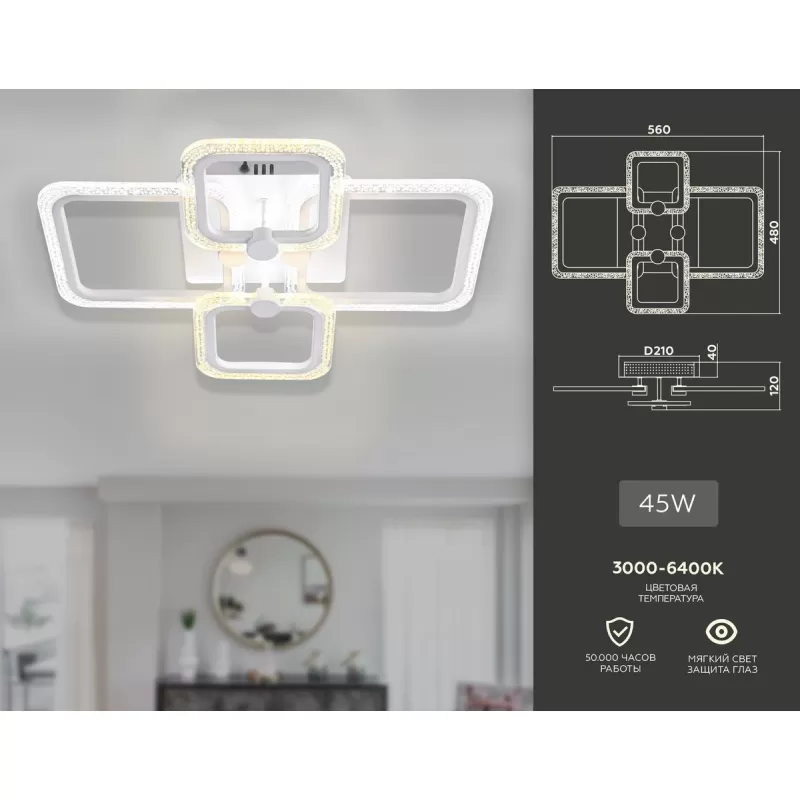 Современный дизайн прибора дает гарантию, что устройство идеально впишется в любое интерьерное решение. Тип — Фигурные потолочные светильники, значит абажур смотрит вниз. Конструкторы применяли прочный материал для абажура, что значительно снизило ценник и вес светильника, а для ключевых элементов для монтажа использовался Металл, это увеличивает эксплуатационные параметры прибора. пластина позволяет в том числе новичку в мире осветительных устройств легко установить эту модель у себя дома. Напряжение прибора насчитывает 220 Вольт, поэтому прибор легко монтируется без дополнительных механизмов.