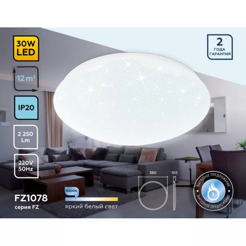 Потолочный светильник ORBITAL FZ1078 Ambrella, можно сказать, жемчужина серии ORBITAL от известного светотехнического производителя Ambrella. Страной производителем выступает Россия. Разработчики данной модели обозначили цель спроектировать максимально гармоничный потолочный осветительный прибор для помещений с низкими потолками и достигли ее. В высоту прибор лишь 10.5 см, хотя диаметр светильника — 38 сантиметров. Данное устройство способно ровно осветить помещения и с максимально невысокими потолками в высоту 2,5-2,6 метра.