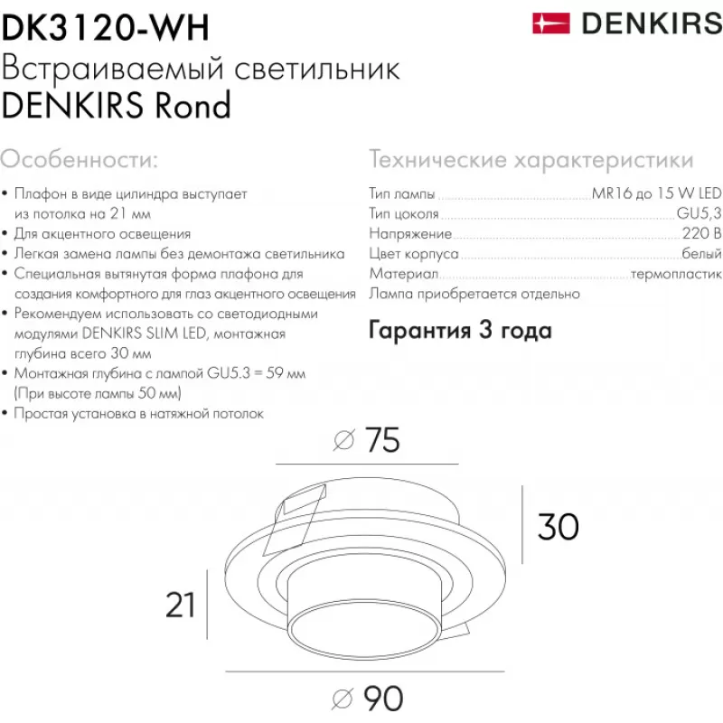 Хотим представить Белый Точечный светильник Rond DK3120-WH Denkirs (форма - цилиндр). Несомненно, элегантное современное изделие, основа высококачественный Пластик, государство разработчик Словения, а значит в качестве и безопасности светильника вы можете не сомневаться. Он поможет качественно украсить убранство любого помещения, сможет подойти как , так и квартиры, дома. Изящный внешний вид цилиндр, плюс Белый оттенок оптимально впишутся в любое стилевое решение.