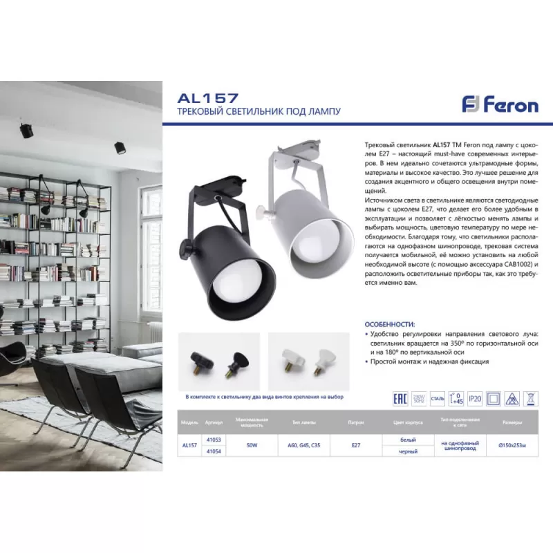 - Трековый светильник 41053 белый конус Feron
