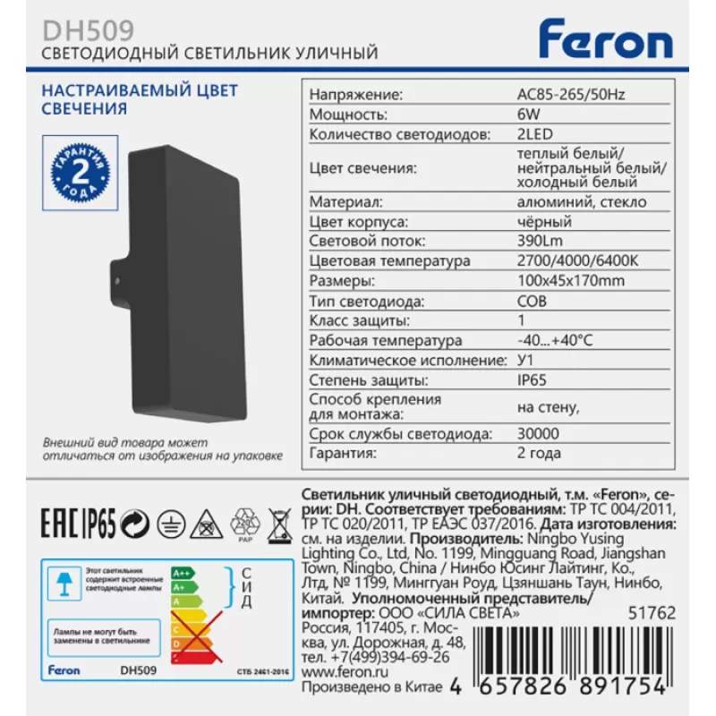 | Цветовая температура, K | 2700-4000-6400 |
